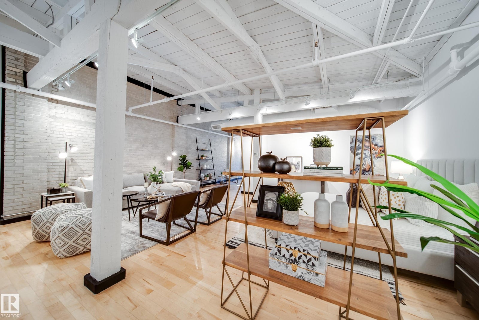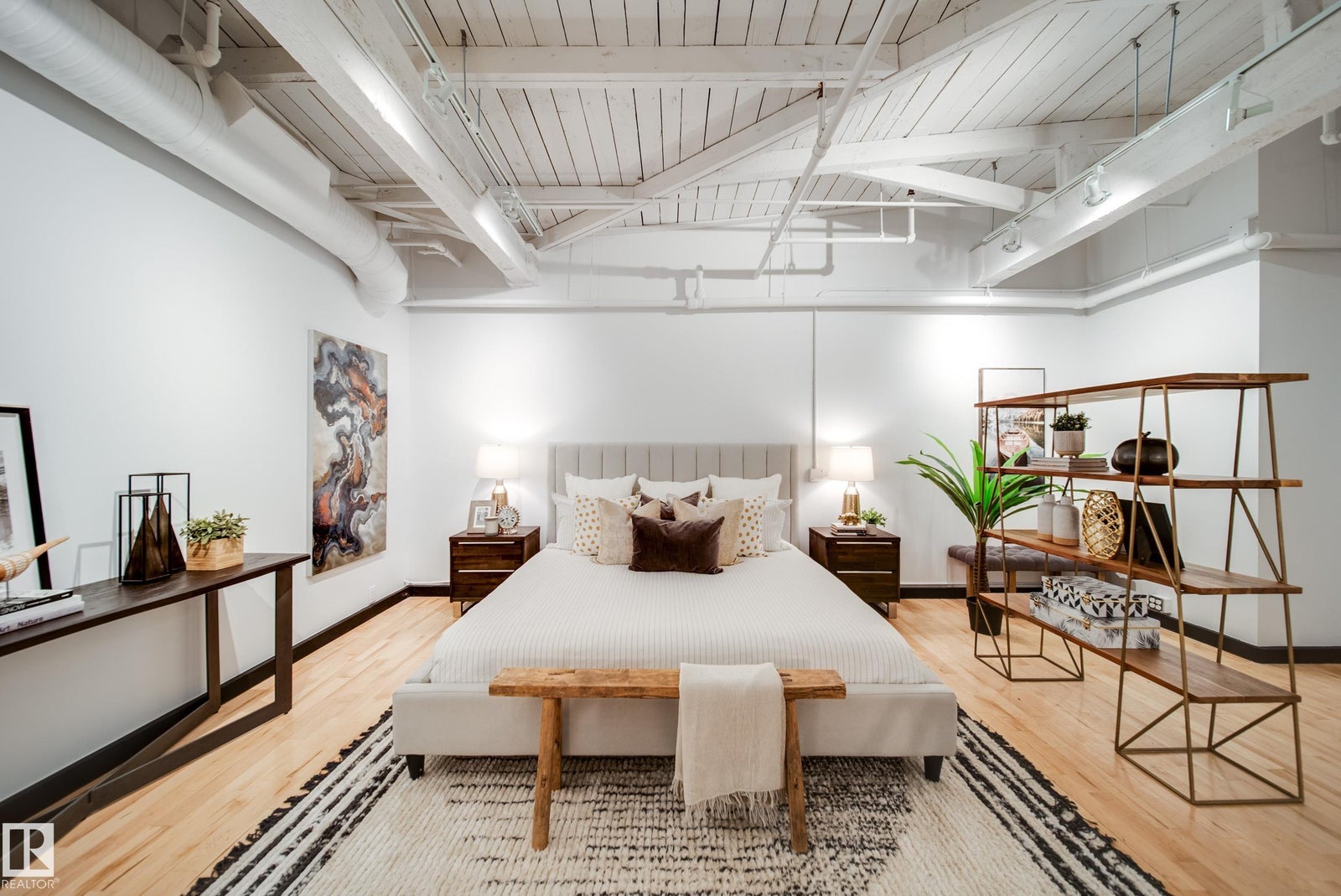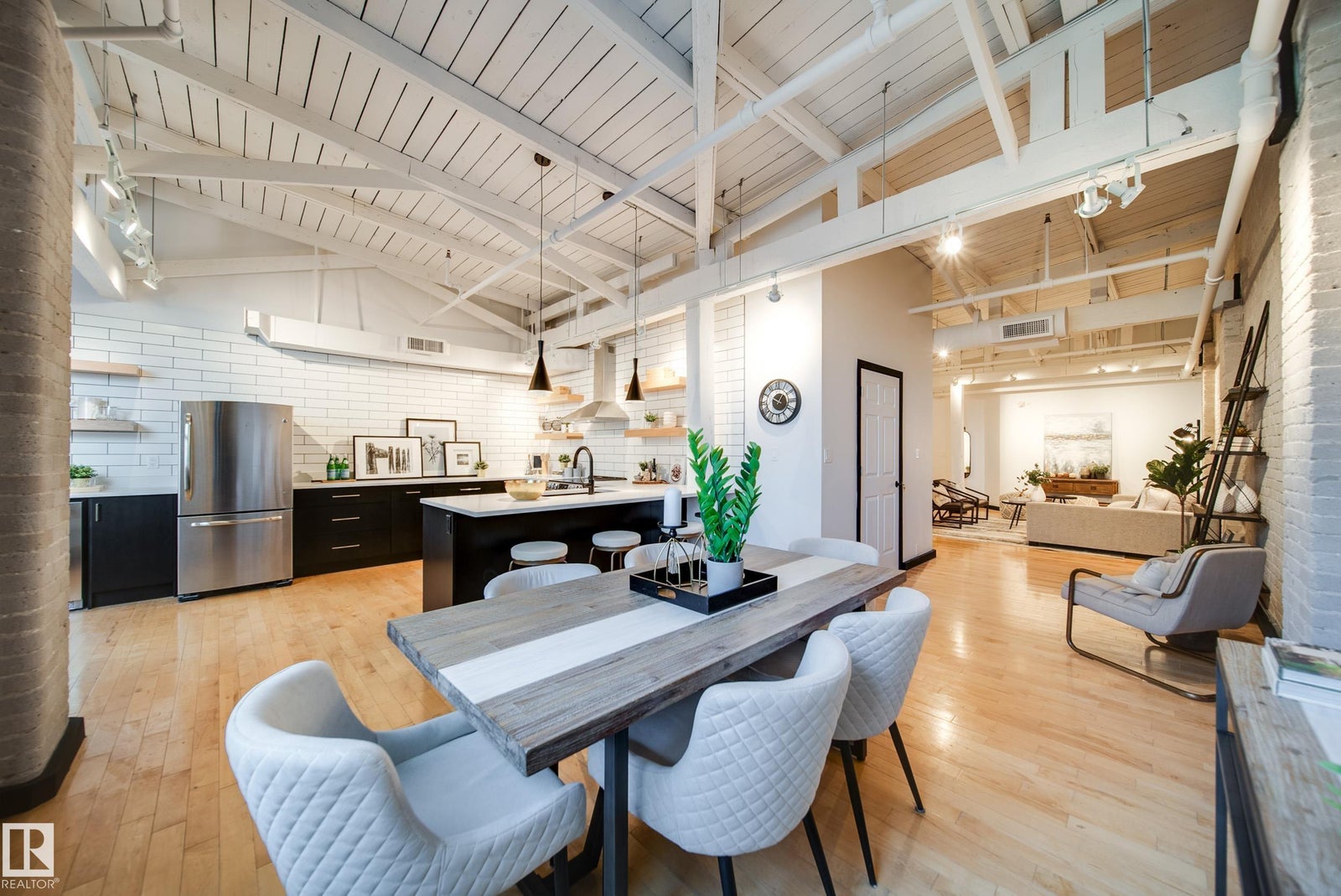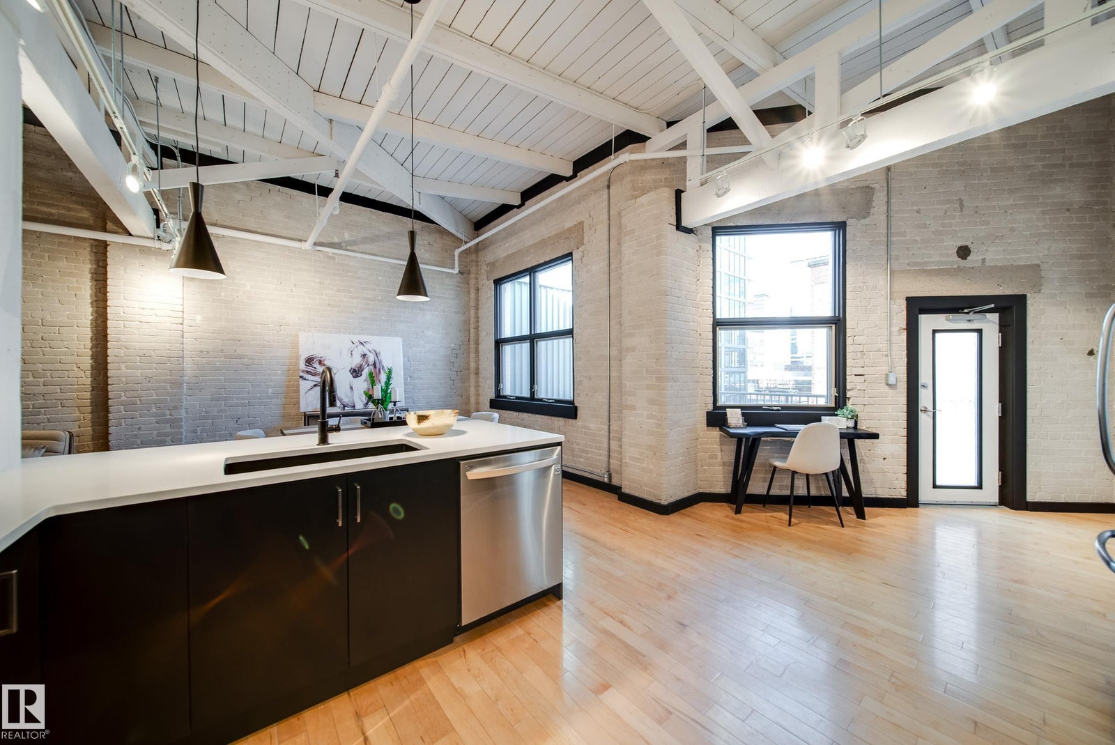 PHILLIPS LOFTS, EDMONTON’S PREMIER LOFT BUILDING, PRESENTS ONE OF THE FINEST UNITS TO HIT THE MARKET! This New York-style loft, steeped in history, is located in the heart of the warehouse district—ideal for those seeking an urban lifestyle with walkability, entertainment, restaurants, and just steps to Rogers Place. Situated on the top floor, this fully renovated unit boasts 13' ceilings and original beams that are over 100 years old. Every inch of this space has been updated with high-quality renovations, including a brand-new bathroom and kitchen featuring custom cabinetry, tile work, appliances, plumbing, and counters. The large bedroom area, dining space, and dedicated home office make it a perfect fit for modern living. Few units offer a balcony, but this one does! With central AC, pet-friendly policies, and access to a rooftop patio, this lock-and-leave property is an entertainer's dream. Don’t miss out!