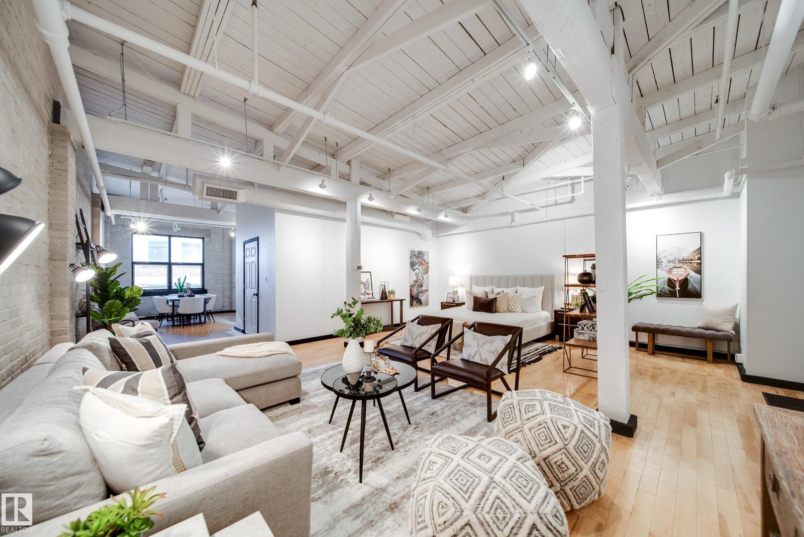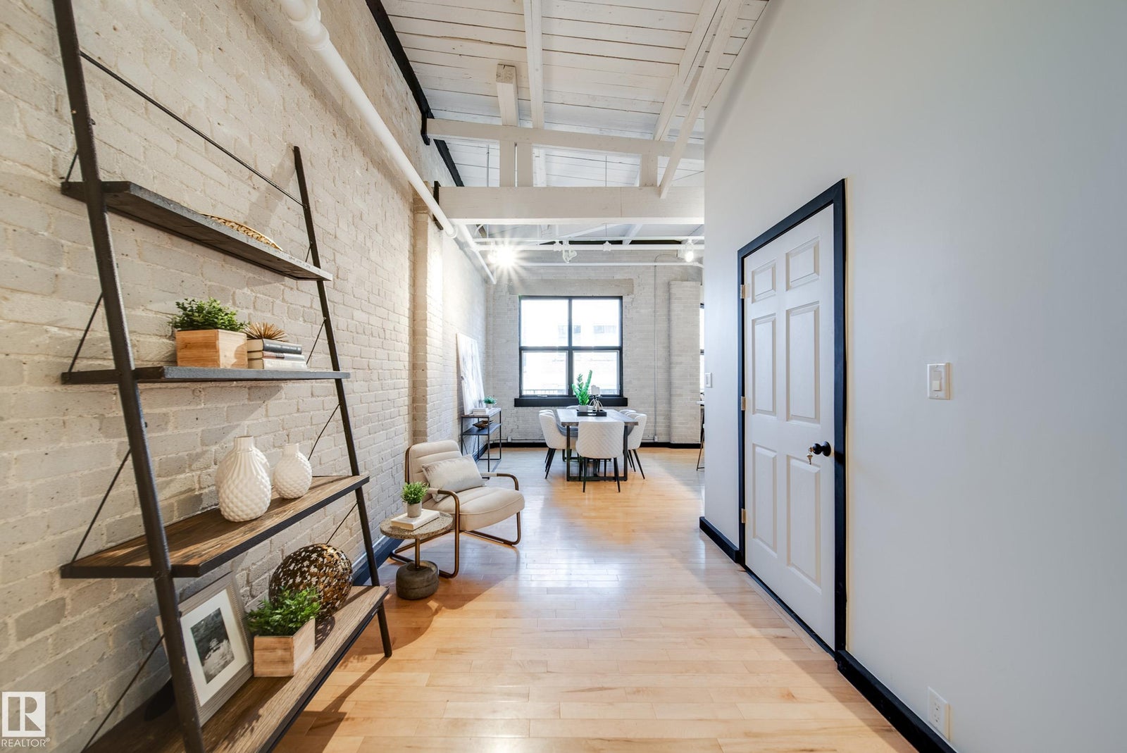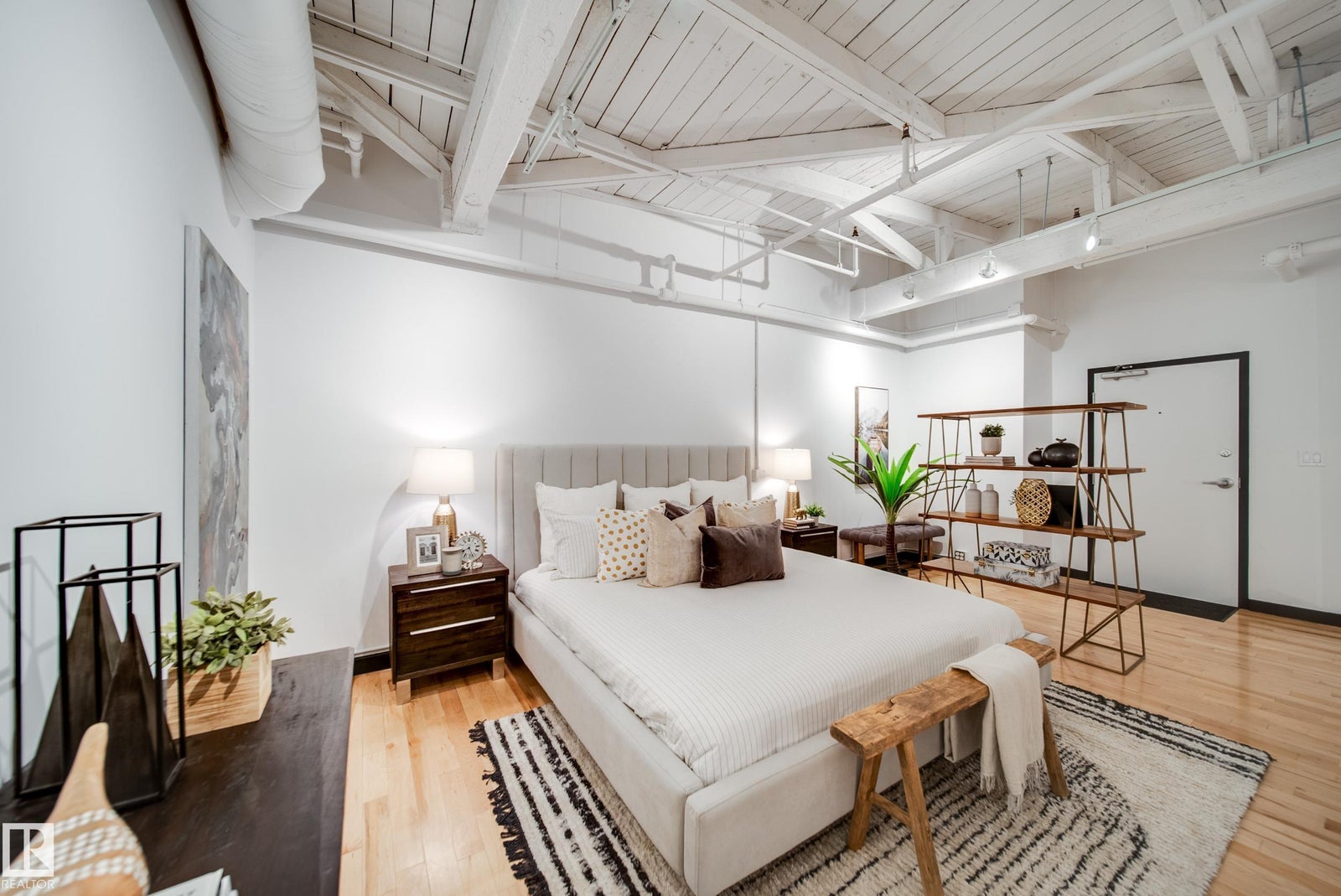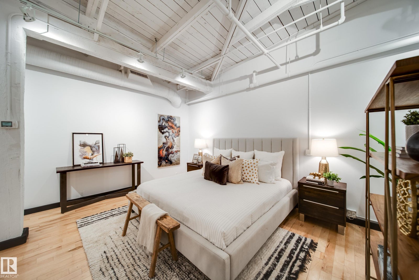 PHILLIPS LOFTS, EDMONTON’S PREMIER LOFT BUILDING, PRESENTS ONE OF THE FINEST UNITS TO HIT THE MARKET! This New York-style loft, steeped in history, is located in the heart of the warehouse district—ideal for those seeking an urban lifestyle with walkability, entertainment, restaurants, and just steps to Rogers Place. Situated on the top floor, this fully renovated unit boasts 13' ceilings and original beams that are over 100 years old. Every inch of this space has been updated with high-quality renovations, including a brand-new bathroom and kitchen featuring custom cabinetry, tile work, appliances, plumbing, and counters. The large bedroom area, dining space, and dedicated home office make it a perfect fit for modern living. Few units offer a balcony, but this one does! With central AC, pet-friendly policies, and access to a rooftop patio, this lock-and-leave property is an entertainer's dream. Don’t miss out!